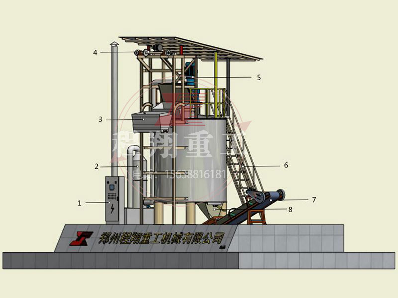 上圖為:有機(jī)肥好氧立式發(fā)酵罐。1-配電柜,2-光氧除臭設(shè)備,3-上料斗,4-提升滾輪,5-電機(jī),6-樓梯,7-移動皮帶輸送機(jī),8-下料口