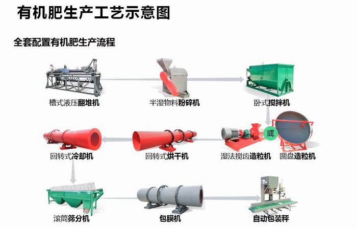 成套的顆粒有機肥生產線主要設備有:有機肥翻堆機、半濕物料粉碎機、臥式攪拌機、有機肥造粒機、滾筒烘干機、冷卻機、滾筒篩分機、包膜機以及自動包裝秤等等。