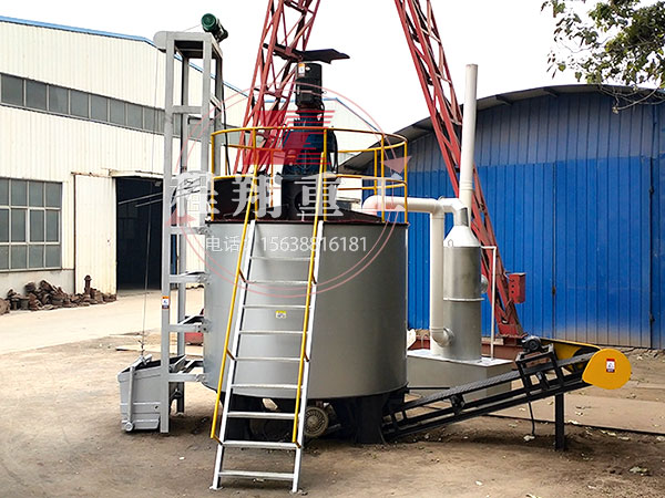 將待發(fā)酵的物料投放到進料提升斗內(nèi),通過電動提升裝置將物料送進發(fā)酵罐中,在投放物料的同時,啟動主電機,通過電機減速機帶動主軸開始攪拌。同時攪拌軸上所帶的螺旋葉片帶動物料翻轉(zhuǎn),使物料與空氣充分接觸,在攪拌的同時,通過高壓羅茨風(fēng)機不斷打入空氣,在發(fā)酵罐底部上端設(shè)計有曝氣管道,對通過的氣體進行加熱,使待發(fā)酵物料開始進行有氧發(fā)酵階段。在加熱的同時通過溫度傳感器對罐體的溫度進行調(diào)控,將發(fā)酵罐的溫度控制在發(fā)酵所需的最佳狀態(tài)。在物料發(fā)酵完畢后,通過出料口排出罐體,進行下一步加工處理。