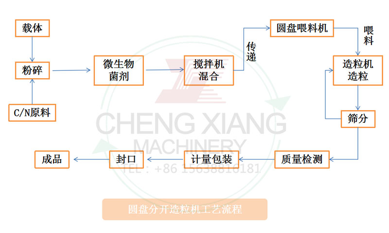 微生物肥料生產(chǎn)工藝的關(guān)鍵是造粒方式的選擇,目前微生物肥料常用的造粒方式主要有兩種(圓盤造粒和擠壓造粒),因不同的造粒方式對原料的要求不同,故生產(chǎn)工藝也會不同。程翔重工通過對四種生產(chǎn)工藝(圓盤混合造粒、混合后擠壓造粒、擠壓造粒后噴加菌劑、分開造粒)的比較研究得知,微生物肥料生產(chǎn)工藝以選擇圓盤分開造粒工藝為佳。因為該工藝可以減少化肥對微生物菌劑的影響,先將載體與菌劑造粒后,存放至中間料倉,再與載體和無機(jī)肥造粒后的粒子混合,最后得產(chǎn)品。