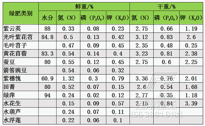 綠肥的養(yǎng)分含量 主要的綠肥種類(lèi)有紫云英、苕子、紫花苜蓿、草木犀等。其養(yǎng)分含量堿表1。
