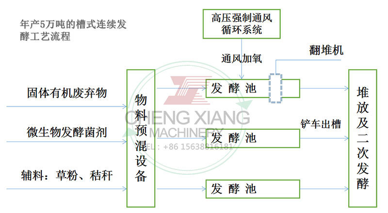 如工藝流程圖所示,每天將畜禽糞便等固體有機廢棄物與秸稈等輔料混合物及發(fā)酵菌劑充分混合,用鏟車均勻地送入發(fā)酵池前端(原始空池前端1/8或翻倒完騰出的池前端1/8),發(fā)酵物料在池內堆積厚度為1.5~1.8米,靠高壓風機強制通風和翻堆時物料與空氣接觸提供的氧氣進行連續(xù)好氧發(fā)酵,使發(fā)酵物料快速腐熟、去水、干燥,發(fā)酵周期7-8天。在翻堆機縱橫向行走機構的運送下,垂直提升機構將發(fā)酵物料從池內挖起提升到水平輸送機構上,水平輸送機構將發(fā)酵物料輸送一段距離(8-10米)后落入池中,這樣發(fā)酵物料就在池內產生一定的位移,使物料在池內有規(guī)律、等距離的漸進式后移,每天從發(fā)酵池尾端將發(fā)酵好的物料(一天的處理量,池長的1/8)用鏟車運走,將發(fā)酵池前端騰出的空間(一天的處理量,池長的1/8)補充新的發(fā)酵物料,從而形成了一種連續(xù)的發(fā)酵過程。發(fā)酵翻堆過程實現(xiàn)了全自動智能化控制。發(fā)酵后的物料堆成料堆儲存的同時進行二次發(fā)酵,進一步腐熟并去除部分水分。堆制一段時間(根據(jù)生產任務及場地決定)后對其進行篩選、磁選去除其中的石塊、鐵件等,調整水分(曬干或烘干)即可作為粉狀有機肥銷售或用作有機肥造粒原料。