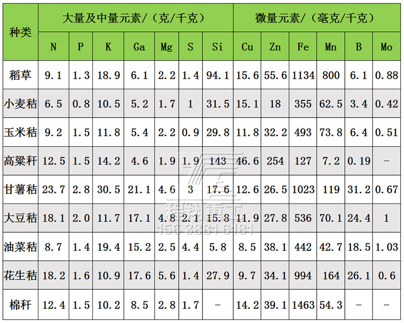 秸稈中含有大量的有機(jī)質(zhì)和氮(N)、磷(P)、鉀(K)、鈣(Ca)、鎂(Mg)、硫(S)、硅(Si)、銅(Cu)、錳(Mn)、鋅(Zn)、鐵(Fe)、鉬(Mo)等營養(yǎng)元素,主要作物秸稈的營養(yǎng)元素含量見表1。