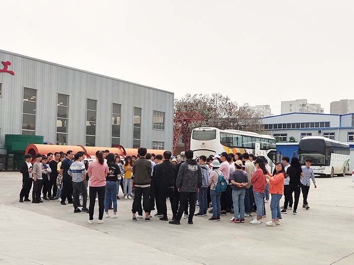 講解員在為師生講解不同型號的滾筒烘干機(jī)以及冷卻機(jī)之間的區(qū)別