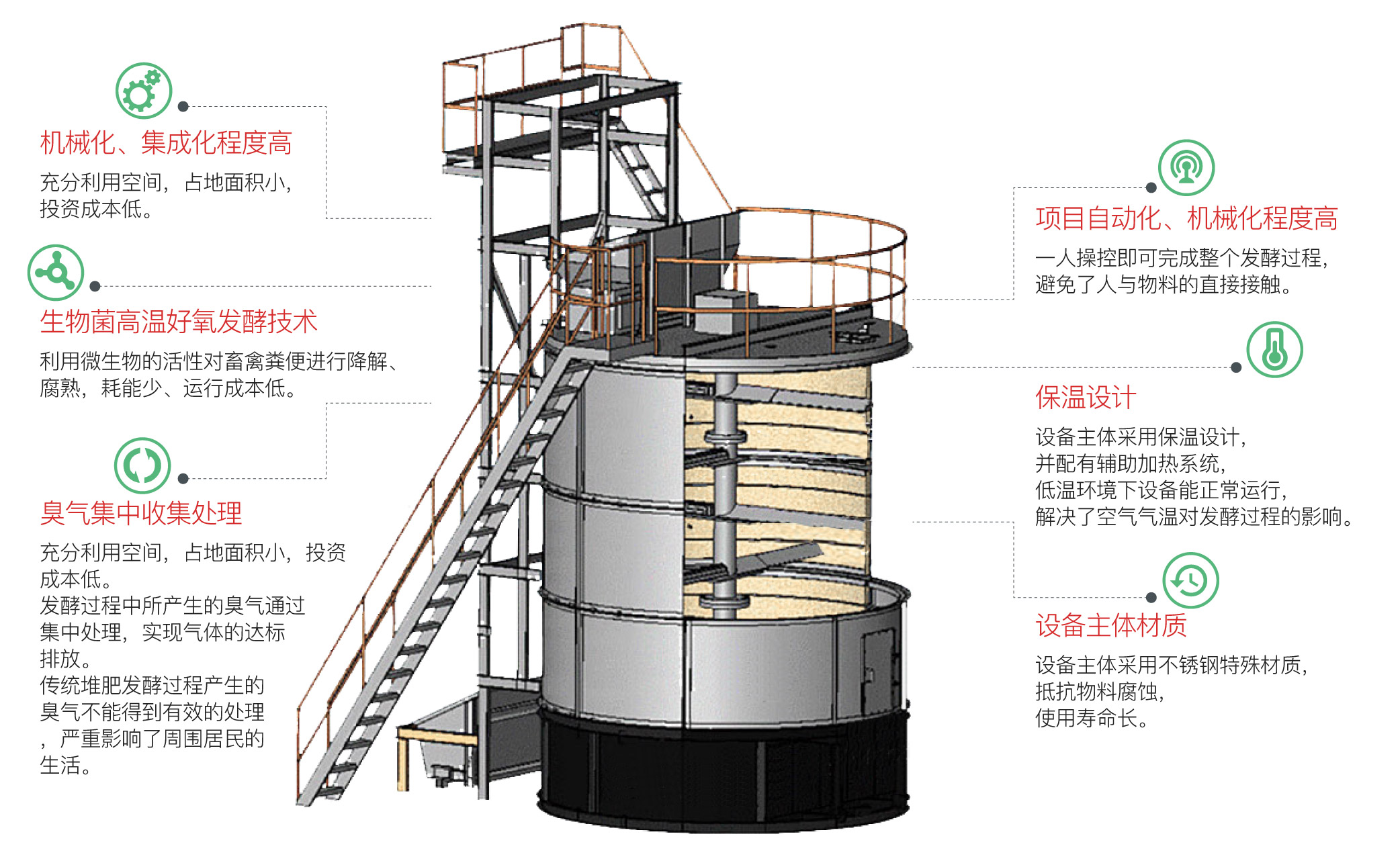 有機(jī)肥好氧立式發(fā)酵罐最大的優(yōu)點是占地面積小,自動化、機(jī)械化程度高,用工成本低。對于土地面積狹小的有機(jī)肥廠比較使用。缺點是能耗較大,設(shè)備投資較高,另一個就是應(yīng)用范圍受限,一般長江以北地區(qū)不適用。