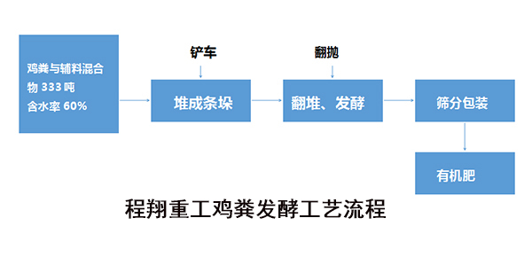 雞糞有機(jī)肥生產(chǎn)工藝路線是將濕雞糞與稻殼(或者其他原料)的混合物的含水量調(diào)到60%左右,利用生物發(fā)酵升溫殺菌,使雞糞含水率進(jìn)一步降低,體積減容,達(dá)到糞便無(wú)害化處理標(biāo)準(zhǔn)要求,制得有機(jī)肥。為了加速發(fā)酵反應(yīng)的進(jìn)行,可在發(fā)酵初期加入發(fā)酵菌劑,在促進(jìn)堆肥升溫的同時(shí),增加活性微生物含量。